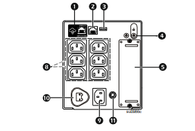 | 7. | Controlled outlet group | 8. | Outlets | 9. | UPS input |