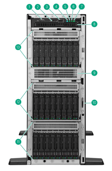 | 9. | Media bay filler panel | 10. | Serial number/iLO information pull tab |