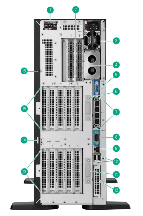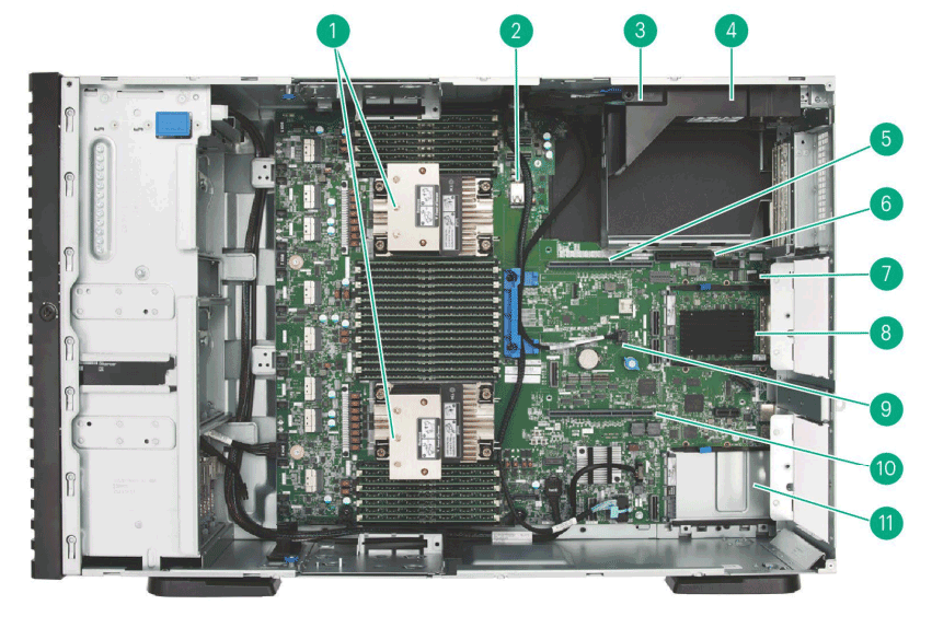| 1. | HPE NS204i-u Gen11 NVMe Hot Plug Boot Optimized Storage Device (Optional) | 2. | PCIe Slots 9-10 (Optional tertiary riser, 2nd processor required for expansion card installation) |