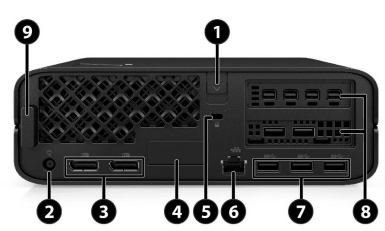 | 1. | Cover release latch | 2. | Power connector | 3. | (2) DisplayPort 1.4 | |
