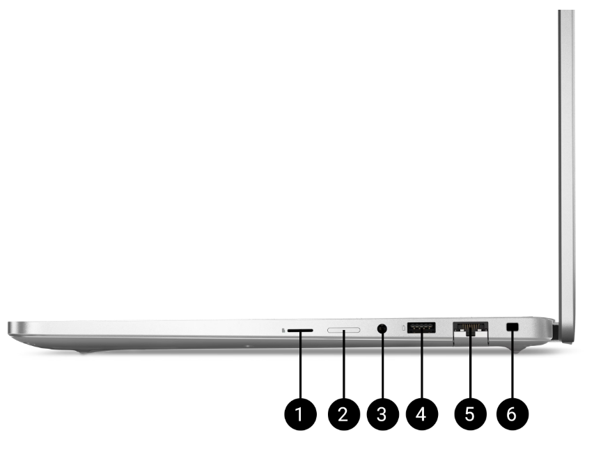 | PORTS, SLOTS & CHASSIS: | 2 x USB Type-C Thunderbolt™ 4.0 with Power Delivery 3.1 & DisplayPort 2.1; 2 x USB 3.2 Gen 1 Type-A (1x with Power share); 1 x HDMI 2.1; 1 x Optional external nano SIM card tray (WWAN only); 1 x Optional Contacted Smart Card Reader ; 1 x Optional Touch Fingerprint Reader in ; Power Button; 1 x Global Headset jack; 1 x Wedge Shaped Lock Slot ; 1 x RJ45, 1GbE (Intel® Core™ Ultra 200U Series only); 1 x Micro SD card reader |