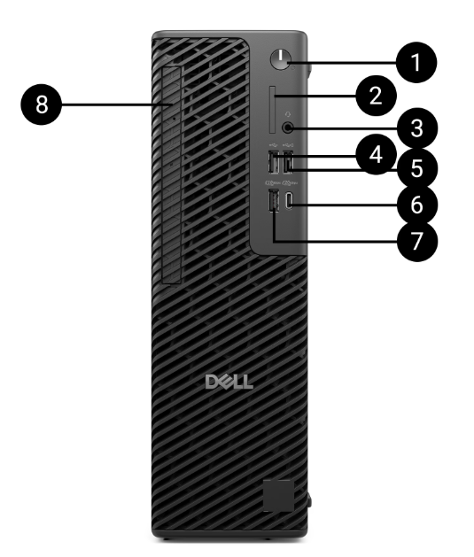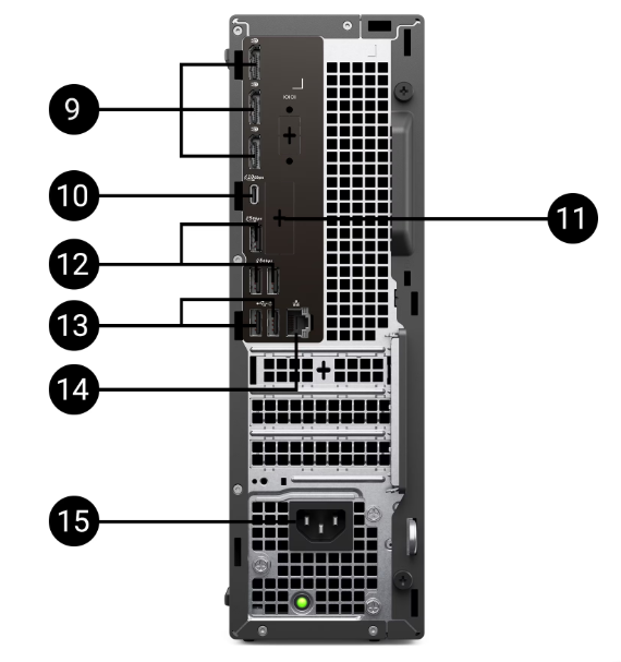 | Ports: | Front: 1 USB 3.2 Gen 2 (10Gbps) port, 1 USB 3.2 Gen 2x2 Type-C (20Gbps) port, 1 USB 2.0 (480Mbps) with PowerShare port, 1 USB 2.0 (480Mbps) ports, 1 Global headset jack ; Rear: 1 RJ45 port 10/100/1000 Mbps, 3 USB 3.2 Gen 1 (5Gbps) ports, 1 USB 3.2 Gen 2 Type-C (10Gbps) port, 2 USB 2.0 (480Mbps) with PowerShare port, 3 DisplayPort 1.4a (HBR3 support) ports, 1 Optional port (VGA, HDMI 2.1 FRL, DisplayPort 2.1 UHBR20, USB 3.2 Gen 2 (10Gbps), USB 3.2 Gen 2 (10Gbps) Type-C with DisplayPort Alt Mode port, Thunderbolt 4 port, Type-C® Data only Gen 2x1 (10Gbps) port, LC Fiber optic port), 1 Legacy serial port (optional), 1 RJ45 (5GbE) Ethernet port (optional) |