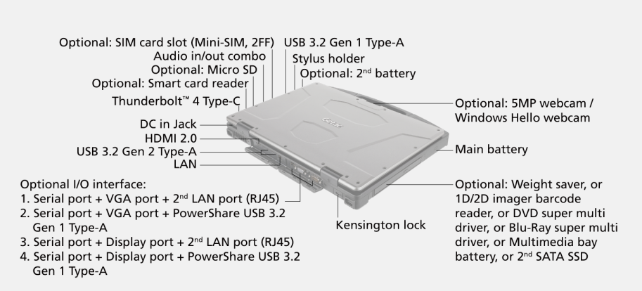 | Rugged Feature: | MIL-STD-810H certified -IP53 certified -Splash resistant keyboard -Vibration & 3ft (0.9m) drop resistant -Sealed ports and connectors -Shock-protected removable SSD |