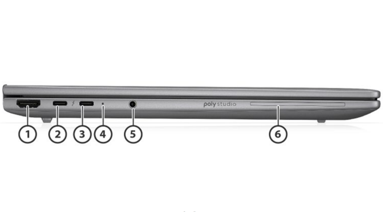 | Ports and connectors: | Left side: 1 HDMI 2.1; 1 headphone/microphone combo; 2 Thunderbolt™ 4 with USB Type-C® 40Gbps signaling rate (USB Power Delivery, DisplayPort™ 2.1) ; Right side: 1 security lock slot; 1 RJ-45 Ethernet port; 1 USB Type-A 5Gbps signaling rate (powered); 1 USB Type-C® 20Gbps signaling rate (USB Power Delivery, DisplayPort™ 1.4) ; Optional Ports: 1 External Nano SIM slot for WWAN |