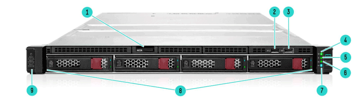 | 7. | Two (2) USB 3.2 Gen1 ports | 8. | Dedicated iLO management port | 9. | Embedded 1GbE x2 network port |